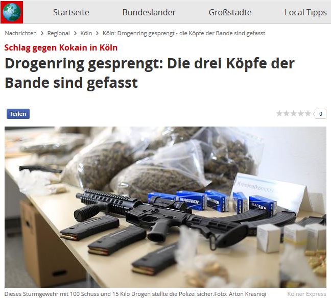 Ishte një ndërhyrje sekrete, një grusht i fortë kundër rrjetit shqiptar të drogës në Gjermani, që u asgjësua falë ndërhyrjes së policisë me ndihmën e njësive speciale. Ata bastisën 23 apartamente në Köln, Brühl, Euskirchen, Aachen dhe Siegburg, shkruan “focus.de”. Tre kokat e bandës (21/27/29) u arrestuan, sëbashku me katër shpërndarës tjerë, përcjell albinfo.ch. Anëtarë të një familje të madhe shqiptare