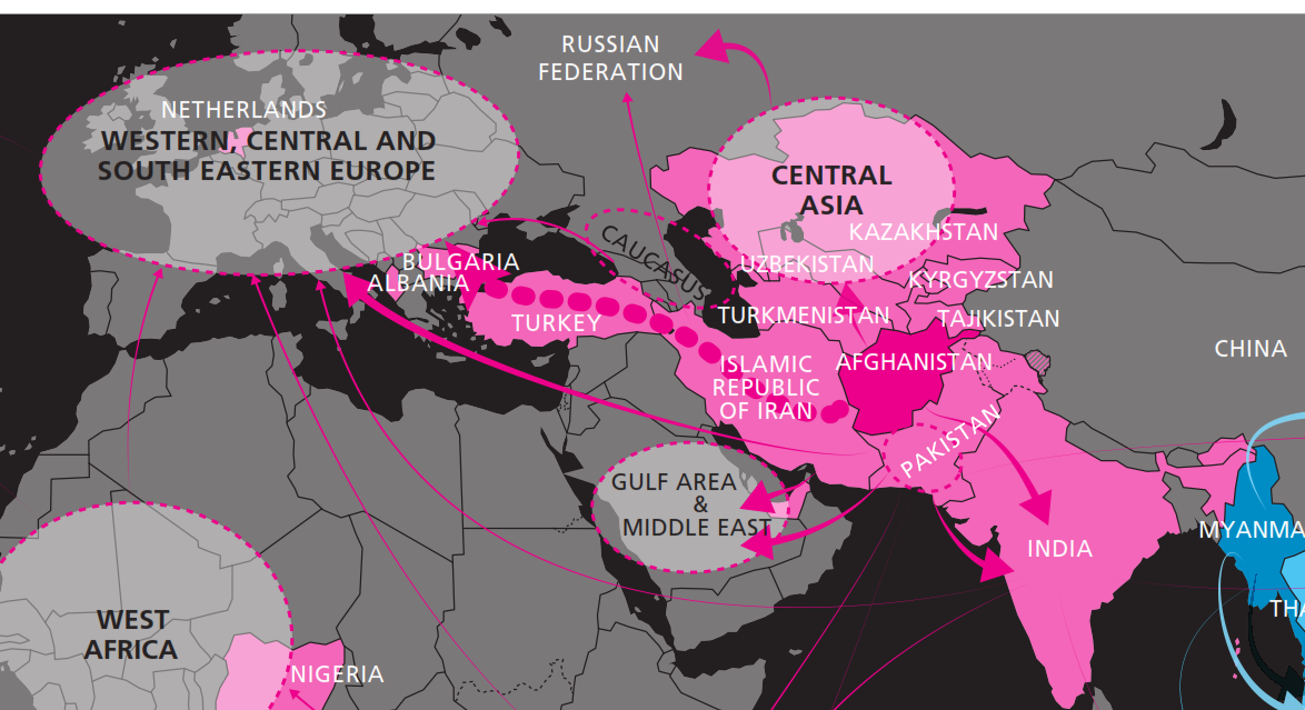Ndërsa në hartën globale, Shqipëria është e përfshirë në rrugën e trafikimit të heroinës nga Azia, me origjinë nga Afganistani, që kalon përmes Turqisë dhe më pas i drejtohen Europës Perëndimor. Bullgaria është një tjetër shtet që përfshihet në këtë gjurmë (shiko hartën globale dhe hartën e zgjeruar vetëm për Europën e Azinë).