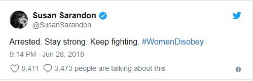 Susan Sarandon është njëra midis 575 grave të arrestuara në Uashington të enjten pasi ato organizuan një protestë kundër politikës së emigracionit me zero tolerancë ndaj Donald Trump brenda një zyre të Senatit në Departamentin e Drejtësisë.