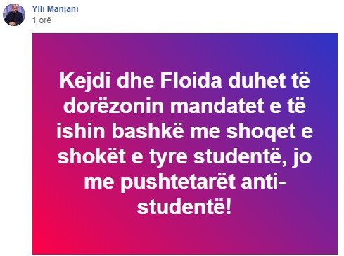 “Kejdi dhe Floida duhet të dorëzonin mandatet e të ishin bashkë me shoqet e shokët e tyre studentë, jo me pushtetarët anti-studentë!”, shkruan Manjani.