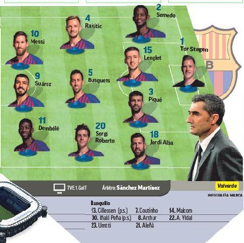 Me takimin që është programuar për tu luajtur në orën 21:00, dy teknikët respektiv, Santiago Solari dhe Ernesto Valverde kanë zbuluar formacionet që do të zbresin në fushën e lojës.