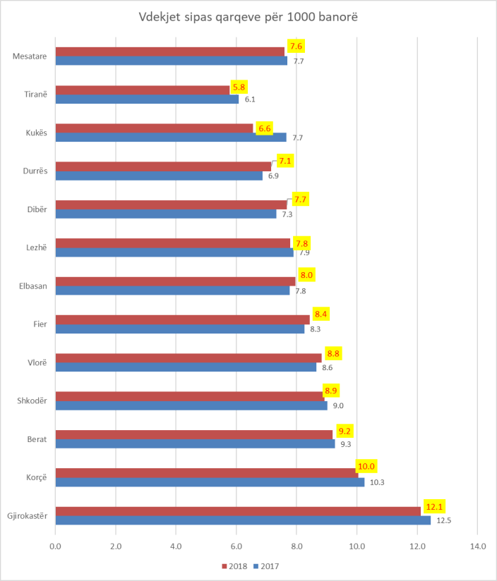 Në dhjetë nga dymbëdhjetë qarqet e vendit, numri i vdekjeve ka pësuar rënie në vitin 2018 në krahasim me vitin 2017.