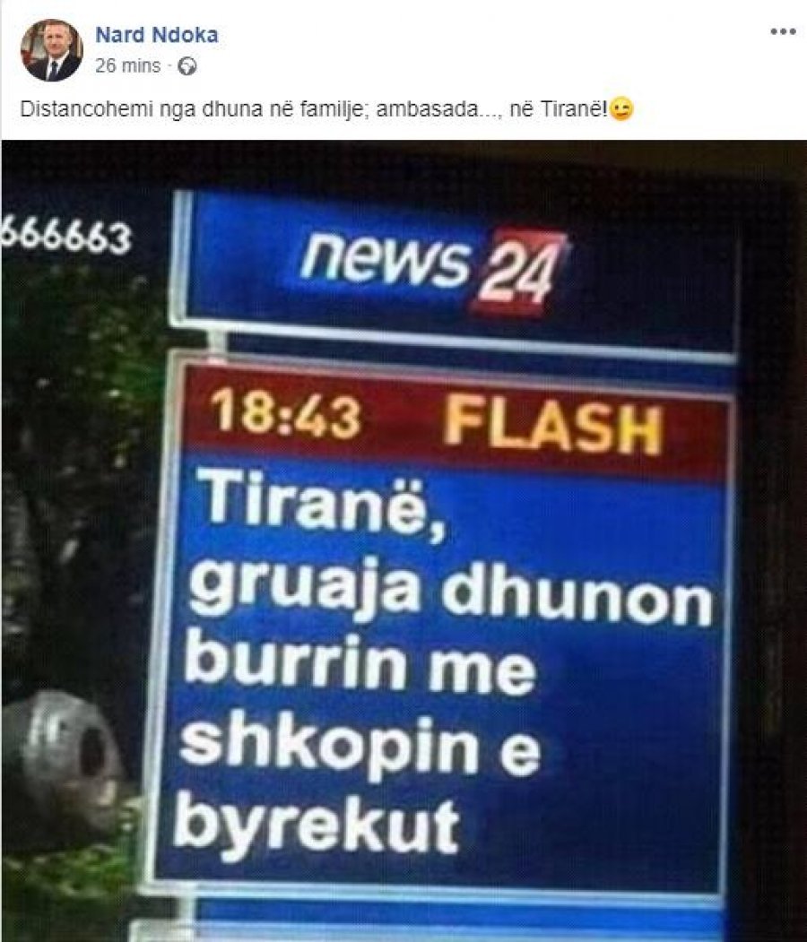 Përmes një postimi në Facebook, kreu i PDK-së ironizon duke shkruar: “Distancohemi nga dhuna në familje; ambasada…, në Tiranë!”, teksa poshtë saj sjell edhe këtë fotomontazh.