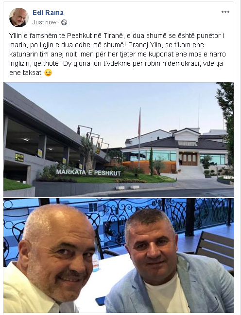 “Yllin e famshëm të Peshkut në Tiranë, e dua shumë se është punëtor i madh, po ligjin e dua edhe më shumë! Pranej Yllo, se t’kom ene katunarin tim anej nolt, men për her tjetër me kuponat ene mos e harro inglizin, që thotë “Dy gjona jon t’vdekme për robin n’demokraci, vdekja ene taksat”😉, shkruan Rama në FB duke njoftuar kështu se i ka bllokuar biznesin e njohur mikut të tij.