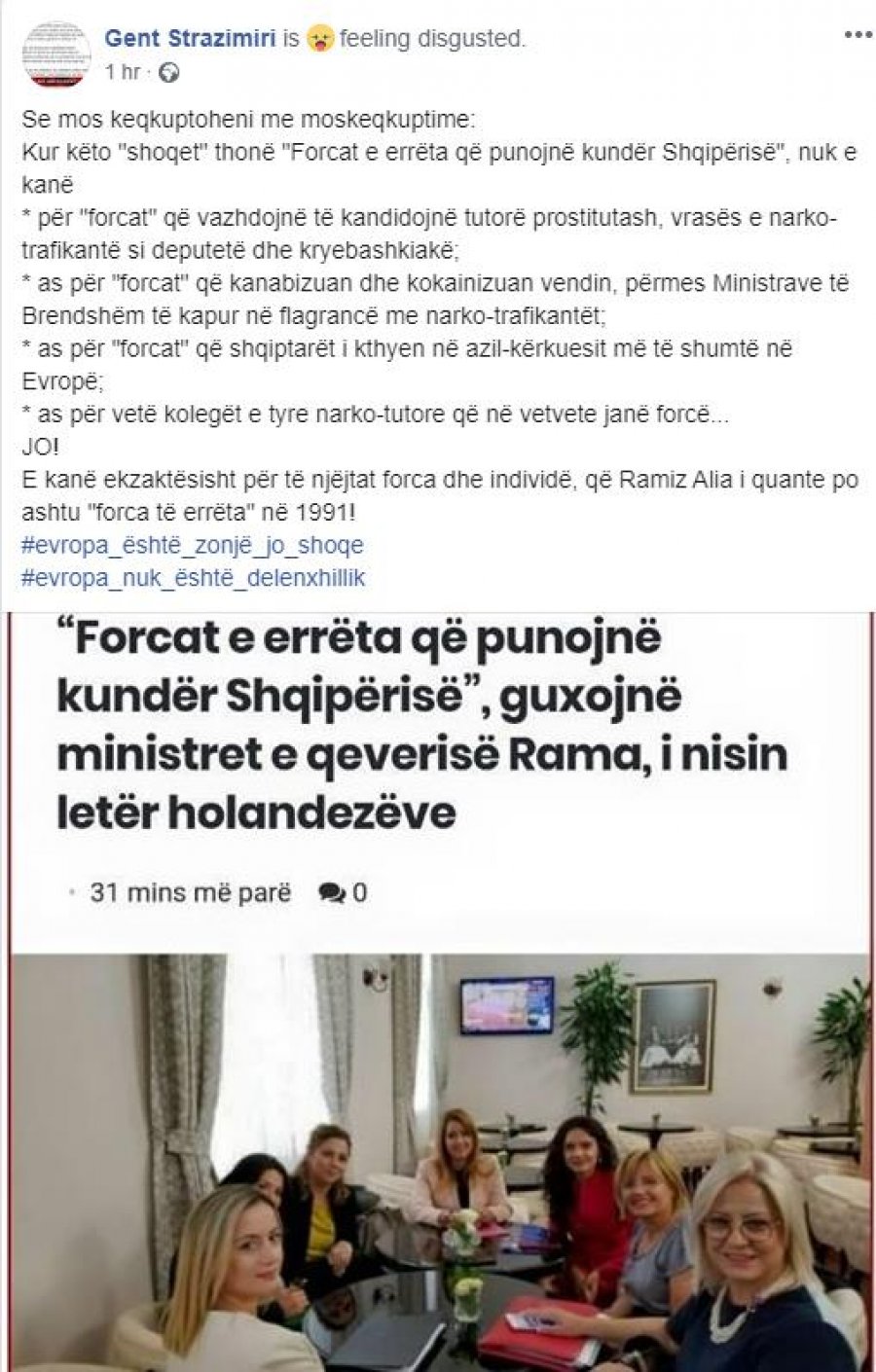 Pas letrës që ministren e qeverisë Rama i kanë nisur Holandës, njëë prej shteteve anëtarë në BE, që është kundër hapjes së negociatave me Shqipërinë, duke përmendur “forcat e errëta” që po përpiqen të ndalin dhe të zbehin “shkëlqimin” e vendit falë qeverisjes së Rilindjes, vjen reagimi i ish-deputetit të PD, Gent Strazimiri.