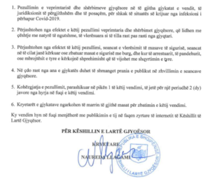 Gjithashtu, përjashtohen nga efektet e pezullimit, “seancat e vlerësimit të masavet ë sigurisë, seancat në të cilat janë kërkuar ose zbatuar masat e sigurisë me burg, dhe kur të arrestuarit, i pandehuri ose mbrojtësit e tyre e kërkojnë shprehimisht që të vijohet me shqyrtimin e tyre”. Kohëzgjatja e këtij vendimi do të jetë për një periudhë dy javore, thotë KLGJ.