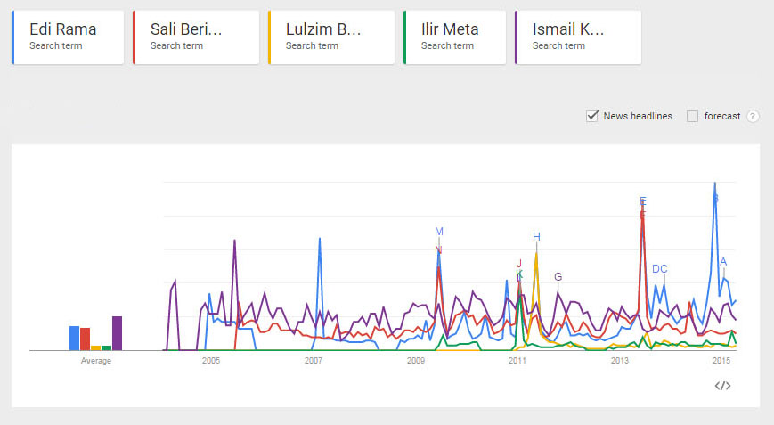 Prezenca e parë në internet për Edi Ramën shënohet në vitin 2006, por ai qëndron më dendur përgjatë dy viteve të fundit duke kapërcyer Sali Berishën. Ndërkohë shënimet elektronike për Berishën numërohen që në vitin 2004.