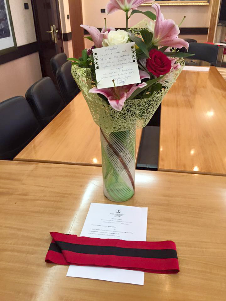 Një tufë me lule dhe një mbishkrim ku i urohet suksese.