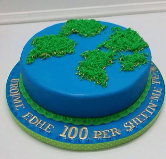 Ky ka qenë urimi për ministrin e Mjedisit Lefter Koka vendosur në një tortë në formën e globit ku mbizotëronte ngjyra blu dhe jeshilja.