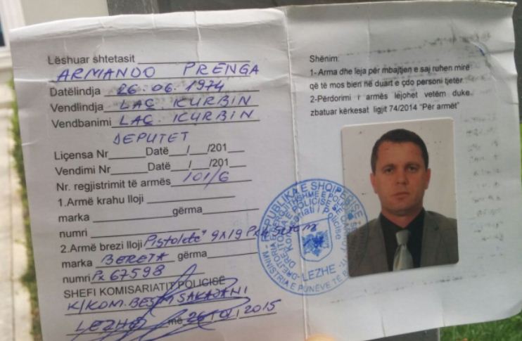 Armando Prenga ka plagosur pjesëtarë të familjes Cali me një armë e që e mbante me leje që prej janarit të këtij viti. Sipas avokatit të tij arma ka qenë me leje dhe pistoleta është e tipit Beretë. Arma është marrë në komisariatin e Lezhës nga edhe është legalizuar mbajtja e saj.