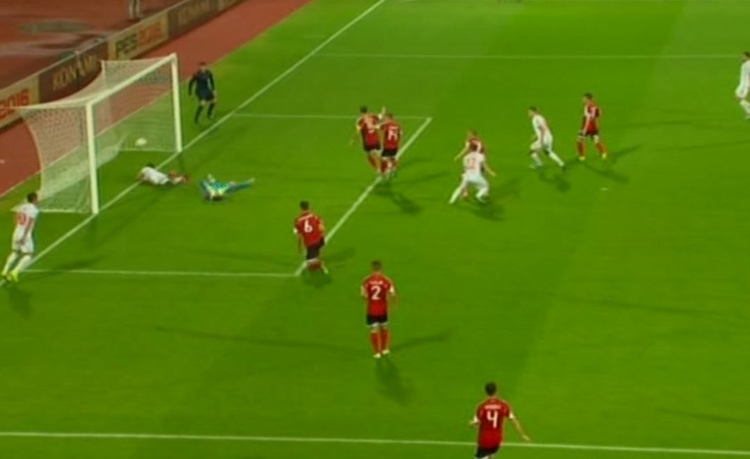 Mitroviç depërton bukur brenda zonës duke lënë mbrapa Canën. Pason në qendër dhe pas një rrëmuje Lajiç e shtyn në rrjetë. Arbitri ndal lojën për faull ndaj Berishës. Ka tension dhe protesta nga pala serbe.