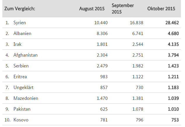 Edhe për muajin tetor shqiptarët kanë qënë të dytët për kërkesat që ata kanë bërë për azil në Gjermani. 4680 shqiptarë kërkuan azil në Gjermani muajin tetor. Kështu sipas Ministrisë së Brëndshme Gjermane e cila ka publikuar shifrat e azilkërkuesve për muajin tetor, tregon se shqiptarët renditen të dytët pas sirianëve me 28.462, ajo që vihet re në shifrat e muajit tetor është se numri i azilkërkuesve nga Kosova ka rënë në 753 duke e renditur atë të 10. Në tetor u regjistruar rreth 2 mijë kërkesa më pak nga ana e shqiptarëve, se në muajin shtator, por serish krahasuar me vendet e tjera të Ballkanit ato janë më të larta.
