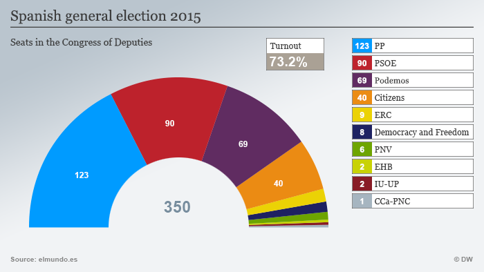 Të dyja partitë janë të reja në peizazhin politik të Spanjës dhe ato përfaqësohen për herë të parë në parlamentin kombëtar spanjoll – e madje me shumica të konsiderueshme mandatesh: 21 përqind për Podemos dhe 14 përqind për Ciudadanos. Fantazma e pamundësisë për qeveriesje, që qarkullonte qysh gjatë luftës elektorale, tashmë është bërë realitet.