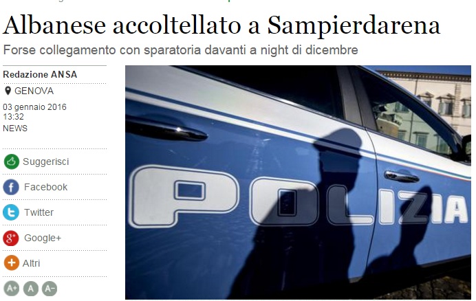 Një 36-vjeçar shqiptar u godit me thikë në bark dhe gjoks mbrëmë pas një sherri në Sampierdarena. Ai është shoqëruar në spital nga pronari i një klubi nate me të cilin ai kishte kaluar mbrëmjen.