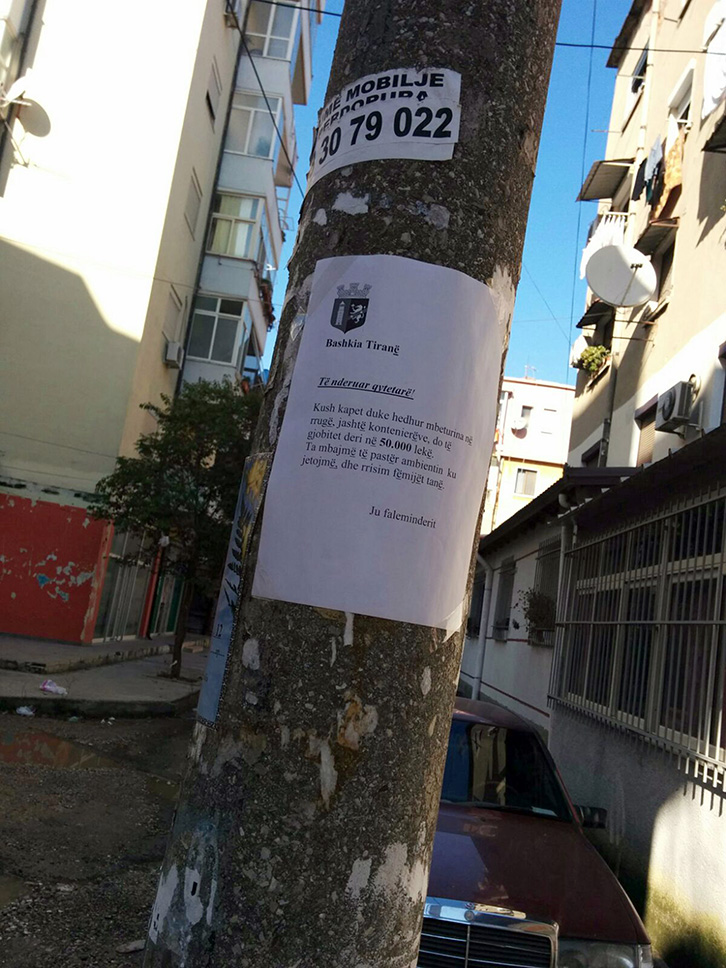 Lajmërimi me logon e bashkisë i ngjitur në shtyllë, duhet ët ishte realisht përpjekje sensibilizuese për mbajtjen pastër të qytetit. Por kur sheh se vetë bashkia e ndot këtë qytet duke ngjitur të tilla lajmërime nëpër pemë e shtylla, shembulli “ndotës” i saj, pak vend lë për të qenë e besueshme në përpjekjen sensibilizuese…