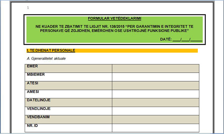 Formulari i parë është ai i vetëdeklarimit që duhet të plotësojë çdo funksionar publik.