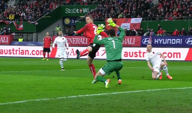 13′ GOL AUSTRIA, Shënon Harnik. Gabim trashanik i Mavrajt që lë topin të kalojë dhe Harnik përfiton duke dalë i vetëm dhe duke realizuar edhe golin e dytë.