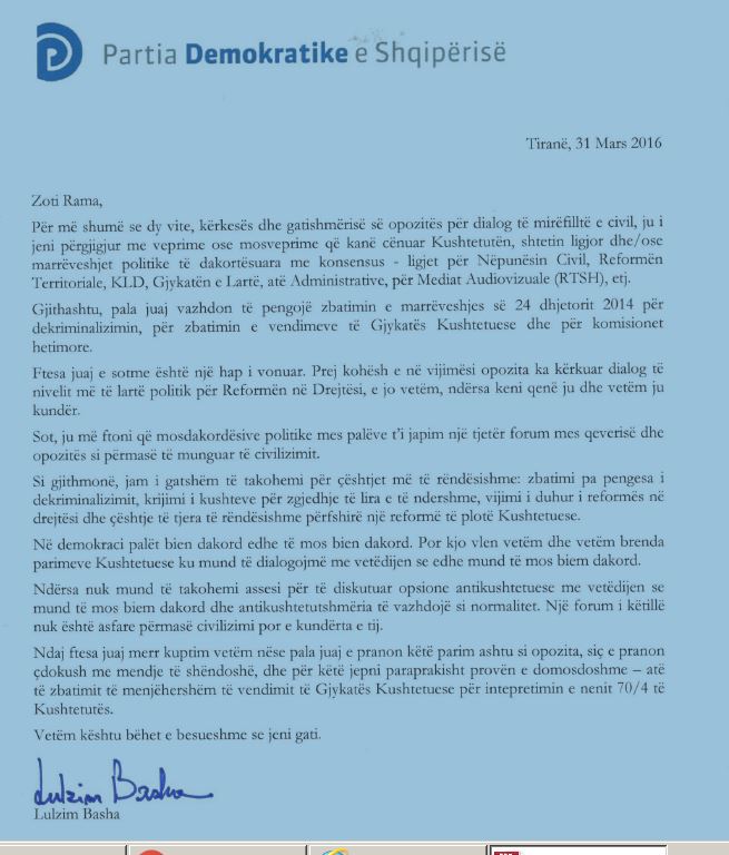 Nëse ky kusht do të pranohet, kreu i opozitës thotë se është gjithmonë i gatshem të takohet për çështjet më të rëndësishme: zbatimi pa pengesa i dekriminalizimit, krijimi i kushteve për zgjedhje të lira e të dnershme, vijimi i duhur i Reformës në Drejtësi, si dhe çështje të tjera, përfshirë një reformë të plotë kushtetuese.