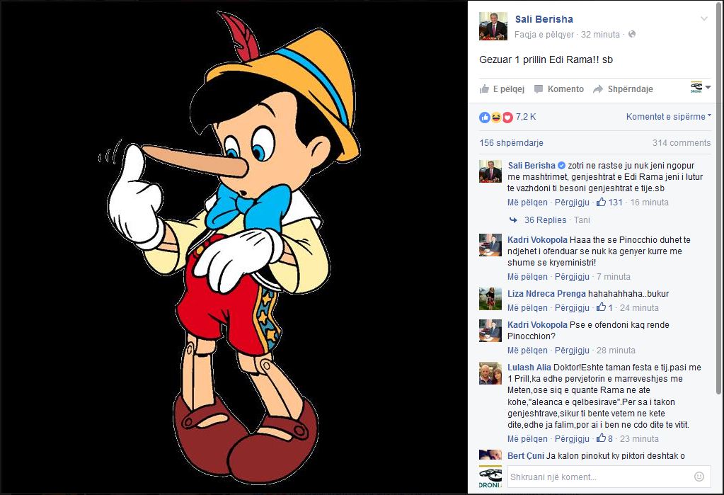 Ish-kryeministri Sali Berisha ka zgjedhur një fotografi të personazhit të Pinokut, si “kartolinë” urim ndaj kryeministrit Edi Rama.