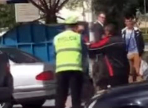 Fatmirësisht qytetari shpëtoi por sikur të mos mjaftonte tronditja e pësuar nga përplasja, shoferi del  nga makina dhe fillon të godasë qytetarin në mes të rrugës, mu para syve të një polici rrugor.