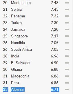 Shqipëria është e fundit në rajon, ku kryeson Mali i Zi me pikësim 7.48, Serbia 7.43 dhe Maqedonia 6.86, shkruan Monitor.