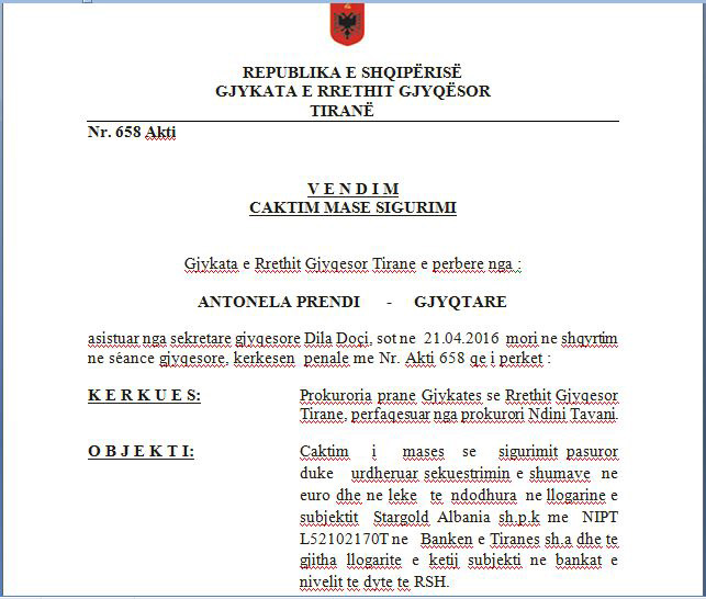 “Dyshimet bazohen dhe në shpeshtësinë e transfertave bankare brenda një periudhe të shkurtër kohore, të cilat për tre muaj arrijnë në shumën 561 644 euro. Njëkohësisht nga informacionet e marra nga autoritetet italiane ekzistojnë të dhëna se ortakët e kësaj shoqërie janë të përfshirë në aktivitete kriminale në Itali. Krijohet dyshimi i arsyeshëm dhe i bazuar në prova se burimi i pasurisë së shoqërisë ‘Stargold Albania’ sh. p. k., janë të ardhurat e siguruara nga aktivitete kriminale. Në këto kushte gjykata vlerëson se është e nevojshme të zbatohet masa e sigurimit ‘sekuestro preventive’ mbi llogarinë bankare të shoqërisë në çdo bankë të nivelit të dytë në RSH” përfundon vendimi.