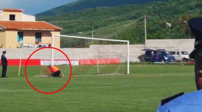 Dhe portieri i vlonjatëve kishte të drejtë, shtyllat ishin më të larta. Punonjësit e fushës më pas bënë centrimin e portës në parametra, pra në lartësinë 2.44m.