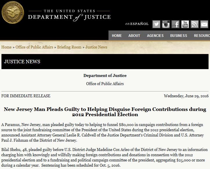 Në bazë të deklarimeve të tij, Shehu një qytetar amerikan që jeton në Nju Xhersi pranoi se në shtator të vitit 2012 ai kishte marrë përafërsisht 80 mijë dollarë nga një burim i huaj dhe i kishte derdhur ato në një komitet mbledhje fondesh dhe në këmbim kishte arritur të siguronte autorizimin e komitetit të fushatës së presidentit në përpjekje për të fshehur origjinën e vërtetë të parave dhe e gjitha kjo me qëllim që një shtetas i huaj të mund të ishte i pranishëm në një takim elektoral që do të zhvillohej në San Fransisko në 8 Tetor 2012.