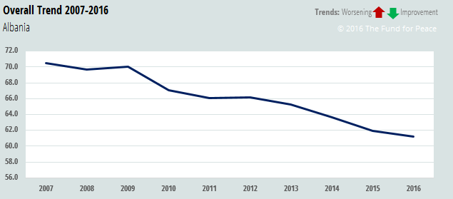 Organizata Fondi për Paqen e njohur për analizat dhe indikatorët e saj për situatën ekonomike dhe politikë të shumë vendeve që nga viti 2006 e ka renditur Shqipërinë në pozitën “paralajmëruese” duke e zbritur atë nga statusi Stabël që ka qenë disa vite më parë.