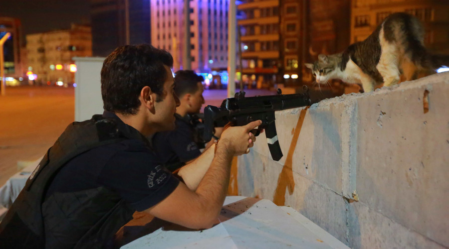 Teksa policia drejtonte armët mbi ushtarët në Stamboll, macja duket teksa ecën e qetë dhe me një vështrim sfidues kalon para policit dhe tytës së armës së tij. Momenti u kap nga një fotograf i “Reuters”.