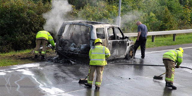 Në autostradën Durrës-Tiranë, përballë një qendre tregtare, ka marrë flakë automjeti tip “Land Rover”, me targa maqedonase dhe në pronësi të R. I.