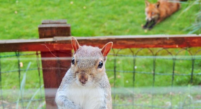 Shkaku është se ketrit ka trokitur në xhamin e dritares së një ndërtese teksa po e ndiqte një dhelpër për ta ngrënë.