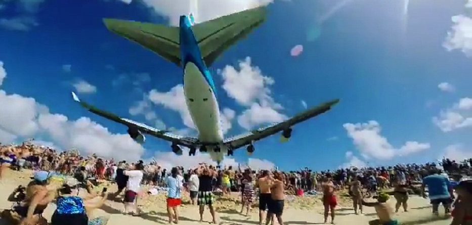 Një avion gjigant mbi kokë. Kjo video vjen nga Maho Beach, Karaibe, dhe tregon se si qindra turistë argëtohen kur një avion pasagjerësh kalon shumë afër kokës së tyre.