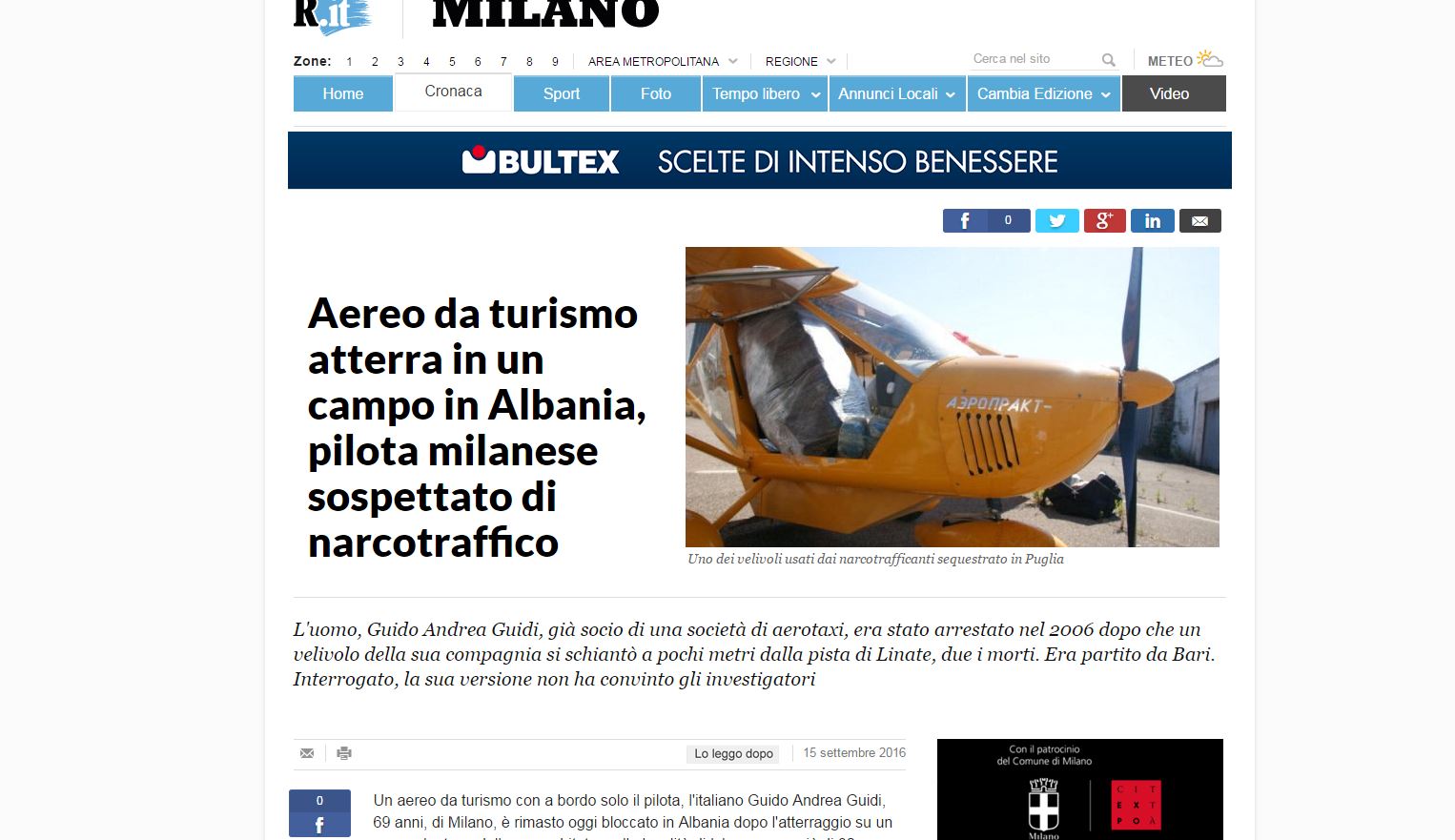 “La Repubblica” shkruan se një avion i vogël me një pilot në bord u rrëzua në Shqipëri, pas uljes së detyruar një fushë shumë larg zonave të banuara, në një vendpushim në Ishëm që ndodhet pak më shumë se 30 km nga Tirana. Gazeta përshkruan se avioni është dëmtuar në krah, ndërsa piloti Guidi ka deklaruar se ka qenë i detyruar të bëjë ulje emergjente për shkak të një defekte. Autoritetet shqiptare, shkruan gazeta dyshonin se avioni ishte i përfshirë në trafikun e drogës edhe pse policia tha se nuk ka gjurmë të ngarkesave me drogë.