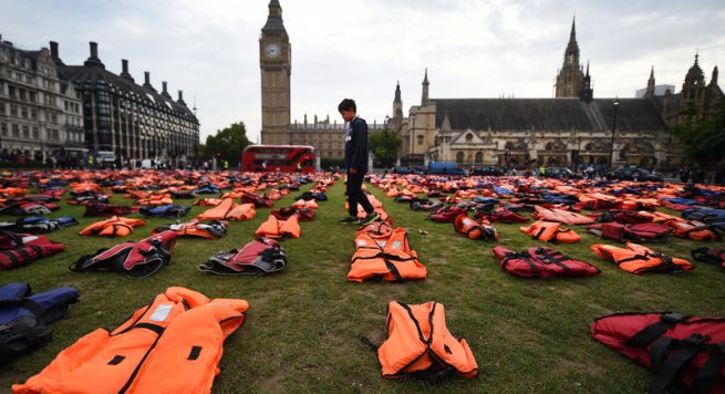 Disa jelekë shpëtimi janë vendosur përpara Parlamentit në Londër të Britanisë. Kjo ndërkohë që liderët botërorë po organizojnë Samitin e Kombeve të Bashkuara në lidhje me çështjen e emigrantëve. Këto jelekë shpëtimi janë vendosur në një park si rikujtesë e vuajtejve dhe rrezikut që qindra mijëra refugjatë kanë përjetuar.