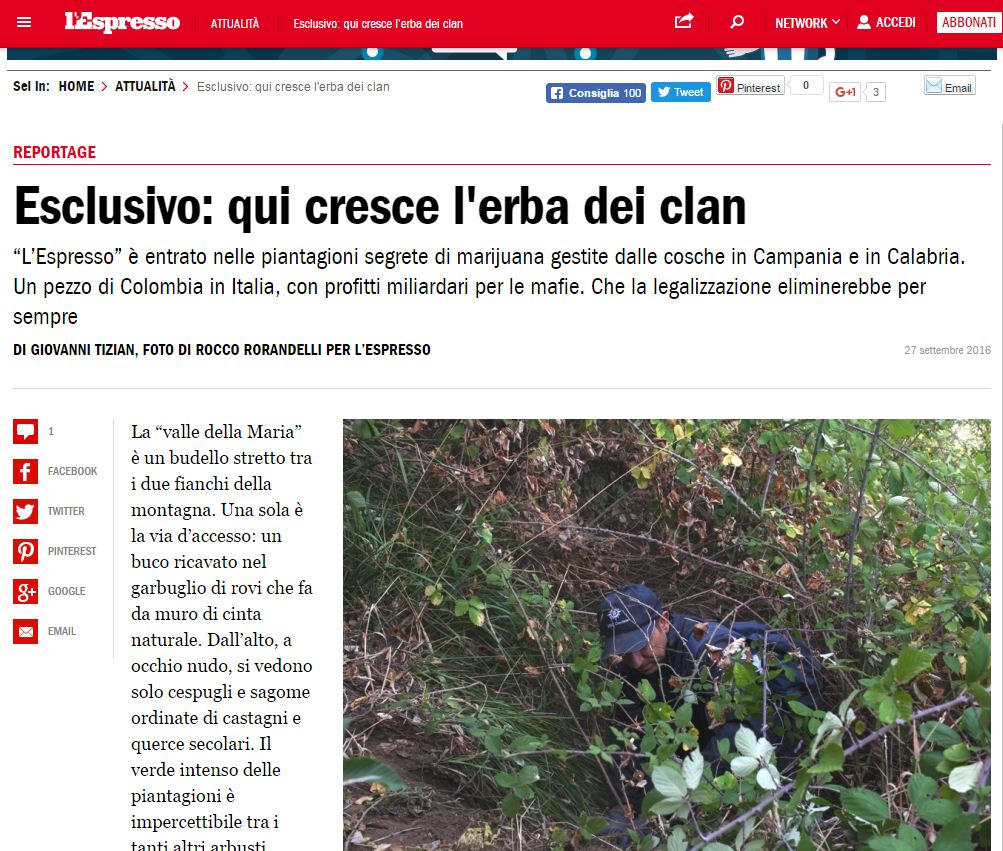 Revista italiane “L’Espresso”, ka kryer një investigim mbi mafien e kanabisit, që e ka kthyer disa pjesë të Italisë në copa Kolumbie. Gazetarët kanë shkuar në plantacionet e drogës në Kalabri nga ku përfitohen miliona euro nga mafia. Por, përveç hashashit që kultivohet në Itali, me qindra ton importohen kryesisht nga Maroku dhe Shqipëria.