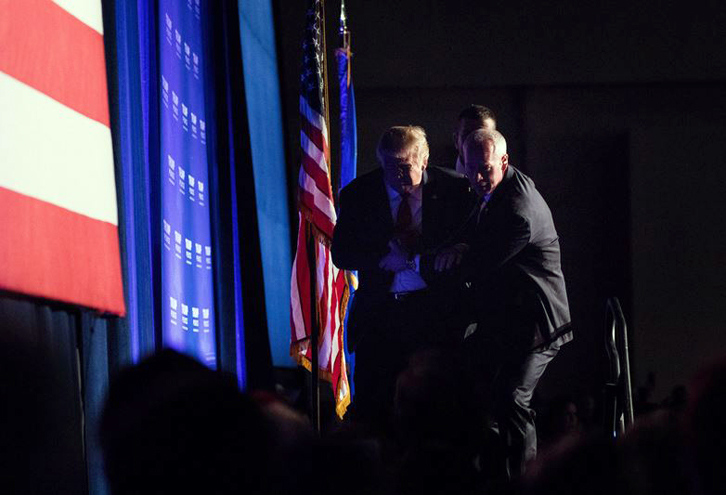 Anëtarët e shërbimit të sigurisë e larguan kandidatin republikan me shpejtësi nga podiumi gjatë një tubimi natën e së shtunës në Reno, pasi një person bërtiti në sallë se dikush kishte një armë.