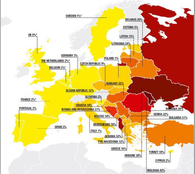 Raporti arrin në përfundimin se, Shqipëria ka normën e tretë më të lartë të ryshfetit në Europë, duke lënë pas vetëm Moldavinë dhe Ukrainën. Në vendin tonë, kjo normë fiksohet pranë 34 %.