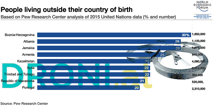 Ndërsa, vendi i parë në botë që ka numrin më të madh të emigrantëve në raport me popullsinë është Bosnje-Hercegovina. Këto të dhëna janë publikuar nga agjencia e statistikave “Pew Research Center”, duke përdorur të dhënat e vitit 2015 të Organizatës së Kombeve të Bashkuara.
