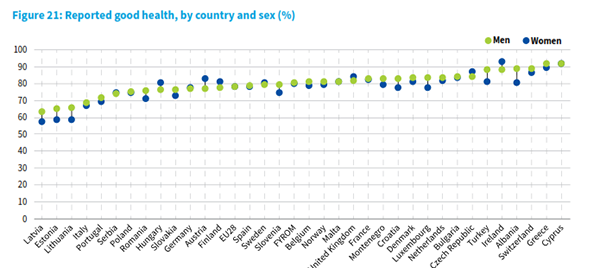 Renditja është më e ulët për femrat shqiptare (tetë në dhjetë femra kanë shëndet të mirë ose shumë të mirë), por gjithsesi edhe ato raportojnë shëndet më të mirë, në krahasim me pjesën më të madhe të vendeve të tjera të Europës.