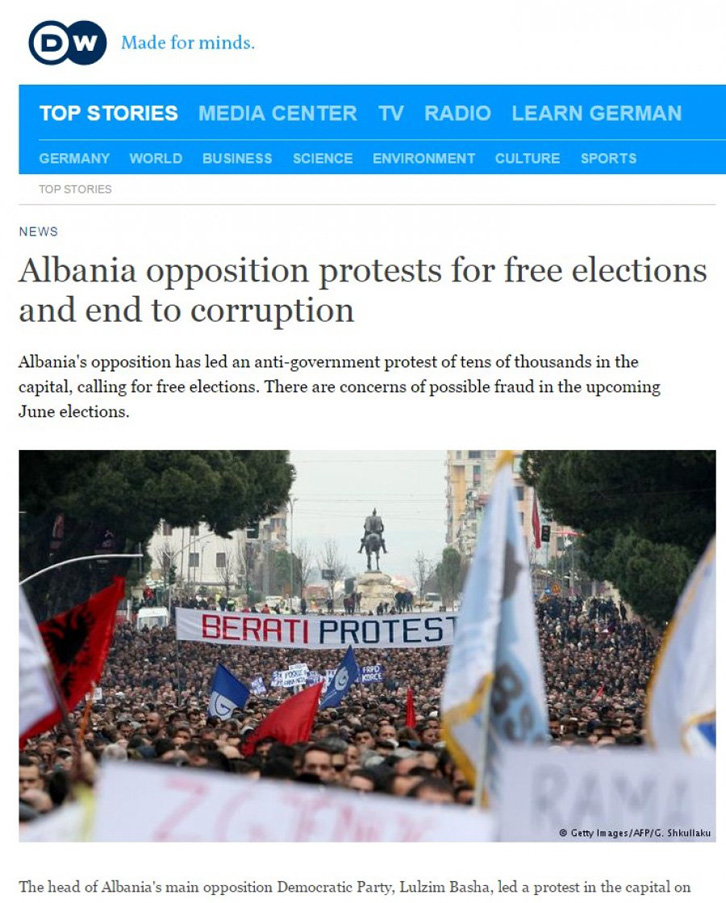 Opozita shqiptare ka nisur një protestë antiqeveritare ku morën pjesë dhjetëra mijëra qytetarë, duke bërë thirrje për zgjedhje të lira. Ka shqetësime të manipulimit të mundshëm të zgjedhjeve të ardhshme të qershorit.