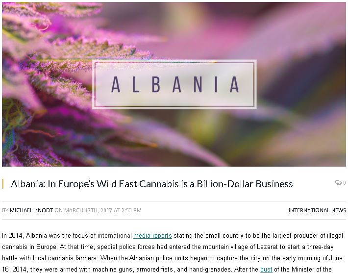 Në një artikull të publikuar në gazetën e specializuar marijuana.com i kushtohet një shkrim prodhimit dhe kultivimit të kanabisit në Shqipëri me autor Michael Knodt.