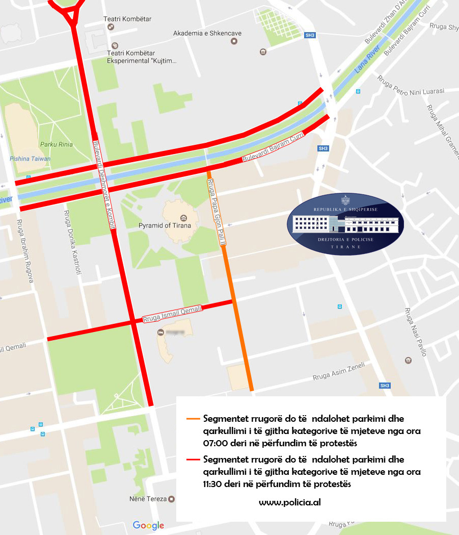 – nga ora 11:30 deri në përfundim të protestës – Sheshi “Skënderbej”, Rruga “Myslym Shyri”, nga kryqëzimi me Rrugën “Ibrahim Rugova” deri tek Kryqëzimi me Bulevardin “Dëshmorët e Kombit” – Bulevardi “Dëshmorët e Kombit” deri tek Kryqëzimi me Rrugën “Ibrahim Rugova”, – Bulevardi “Bajram Curri” nga kryqëzimi me rrugën “Ibrahim Rugova”, deri tek kryqëzimi me rrugën e “Elbasanit”.