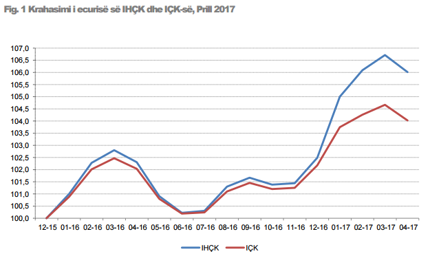 Krahasimi i dy serive të inflacionit total tregon se ndikimin kryesor në ndryshimet vjetore të IÇK-së dhe të IHÇK-së, në tremujorin e parë të vitit 2017, e ka dhënë grupi “Ushqime dhe pije joalkolike”, përkatësisht në masën 75% dhe 83%.