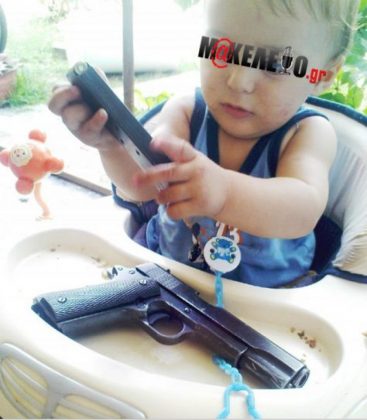 Media helene kanë publikuar edhe një foto të fëmijës së shqiptarit, i cili shfaqet me një armë në duar edhe pse ende nuk mund të ecë me këmbët e veta.
