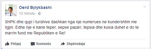 “SHPK dhe qypi i turshive dashkan nga një numërues në kundërshtim me ligjin. Edhe një e kanë tepër, sepse pazari, tepsia dhe kusia duhet e do të marrin fund me Republikën e Re!”, shkruan Bylykbashi në “Facebook”. DRONI.al