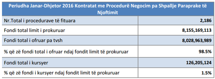 Pavarësisht numrit të lartë, vlera e prokuruar me negocim pa shpallje është vetëm 8 miliardë lekë ose rreth 7.5 % e totalit të vlerës se prokuruar për 2016, prej 108 miliardë lekësh.