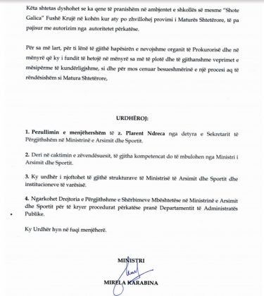Ministrja e Arsimit, Mirela Karabina ka vendosur që të pezullojë nga detyra Sekretarin e Përgjithshëm të ministrisë, Plarent Ndrecën.