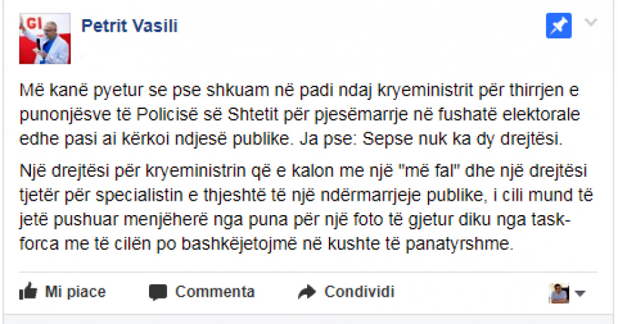 Postimi i plotë i Petrit Vasilit në “Facebook”