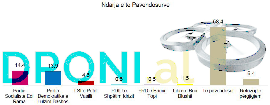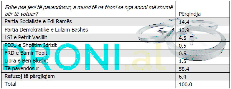 Edhe të pavendosurit ndahen në mënyrë pothuajse të barabartë në preferencën e mundshme mes dy partive të mëdha, respektivisht 14.4% për PS dhe 13.9% për PD. Megjithatë, 58.4% e tyre vazhdojnë të mos kenë ende ndonjë preferencë.